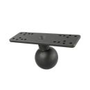 RAM-D-115BU, universel monteringsplade, består af en kugle med en diameter på 2,25″, vinkelret forbundet til en flad 6,25″ x 2″ rektangulær plade. Pladen indeholder forskellige kombinationer af forborede huller, der passer til mange elektroniske enheder.